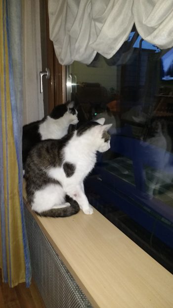 Heute morgen war ich natürlich schlagkaputt, aber die Katzen haben doch wieder für Erheiterung gesorgt. Sie sind ja der Meinung, wenn der Diener eh schon da ist, muss man nicht die Katzenklappe benutzen, sondern sich die Tür öffnen lassen. Da standen nun alle drei in der Küche vor der Tür, Madam hat gejammert. Ich mach die Tür auf und Egon geht allen sofort ans Fell. Nix mehr mit raus, lieber untern Tisch….