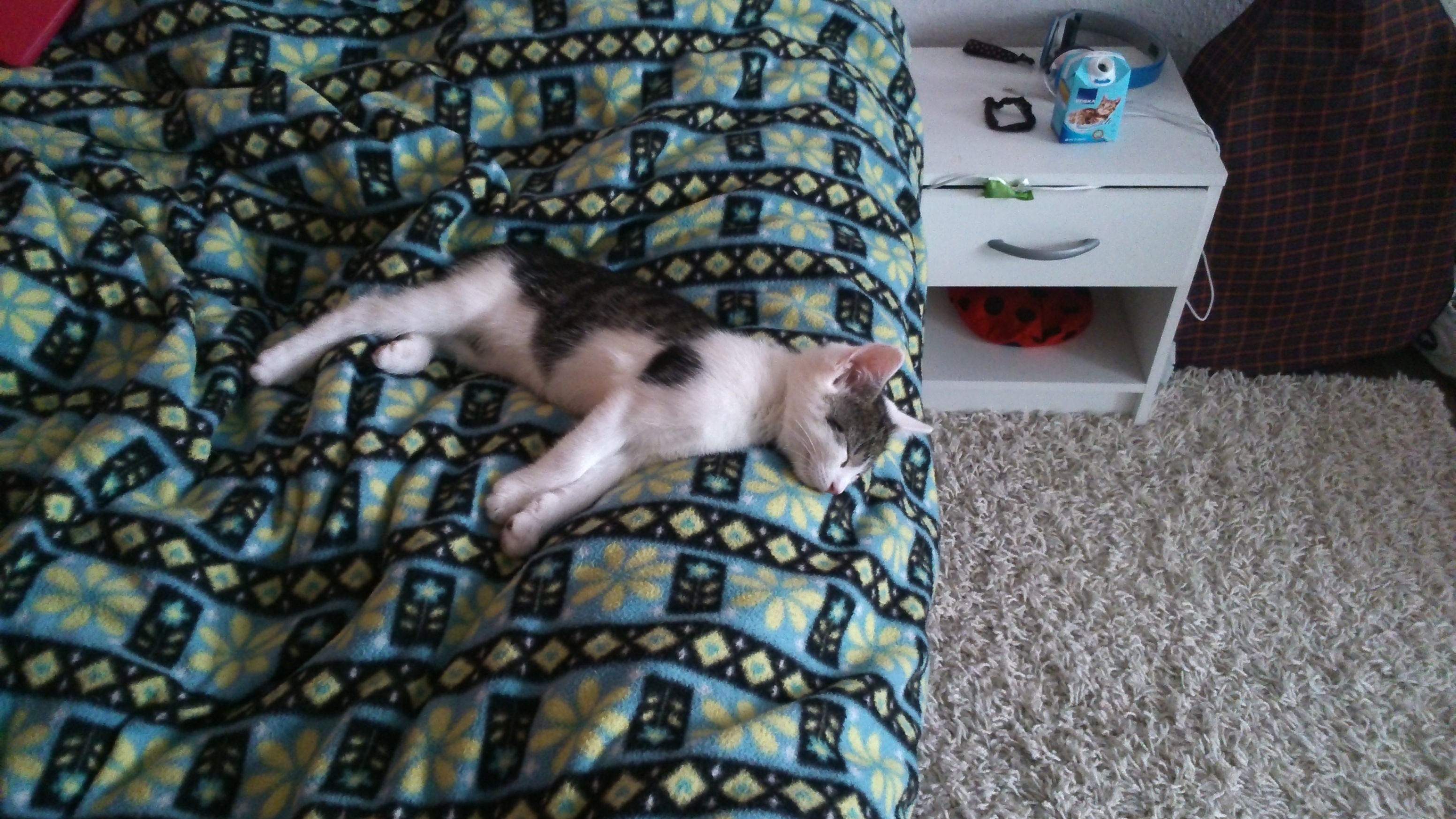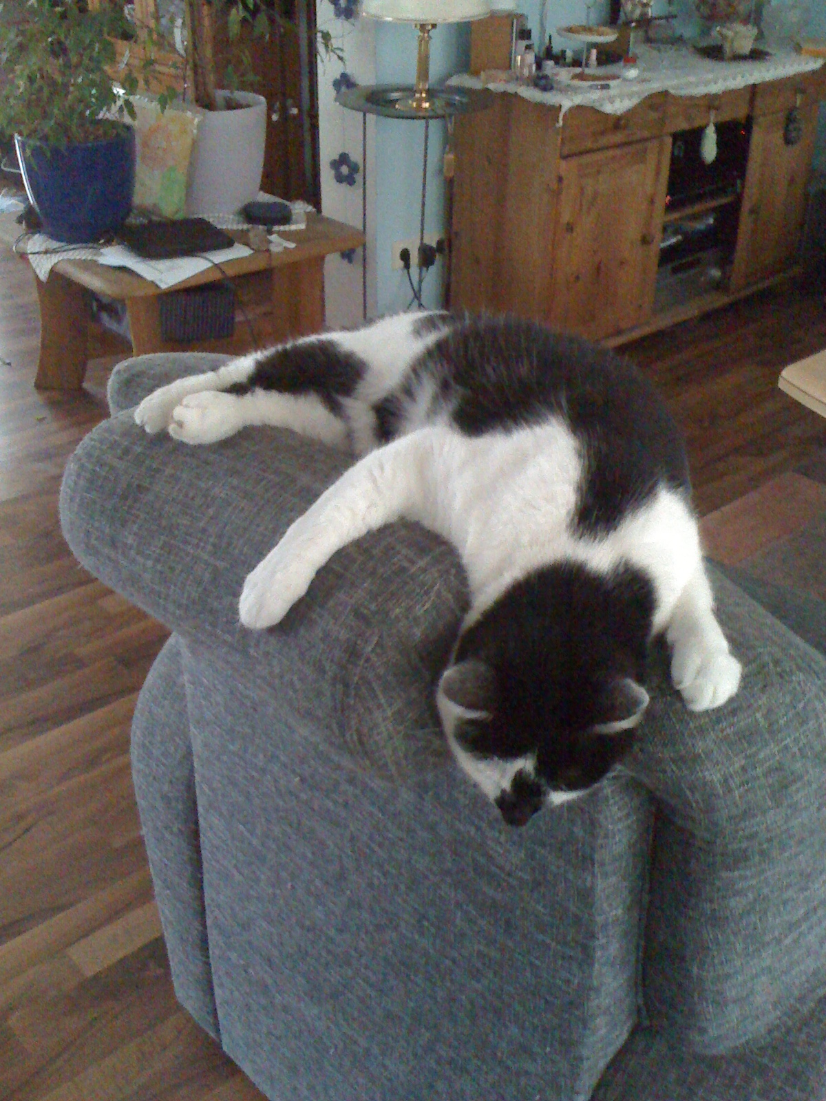 Meistens sind die ja in Action. Und es gibt nichts, was vor Ihnen sicher wäre… Gut, auf den Ventilator an der Decke haben sie es noch nicht geschafft, aber Fräulein Klettermaxe wird das auch noch schaffen. Sehnsüchtig hochschauen tut sie ja schon. Letztens hat sie wohl Fledermaus gespielt – sie hing kopfüber am Vorhang, alle vier Pfoten drinnen verkrallt. Sah echt zum schießen aus, nur leider hatte ich das Handy nicht in der Nähe.