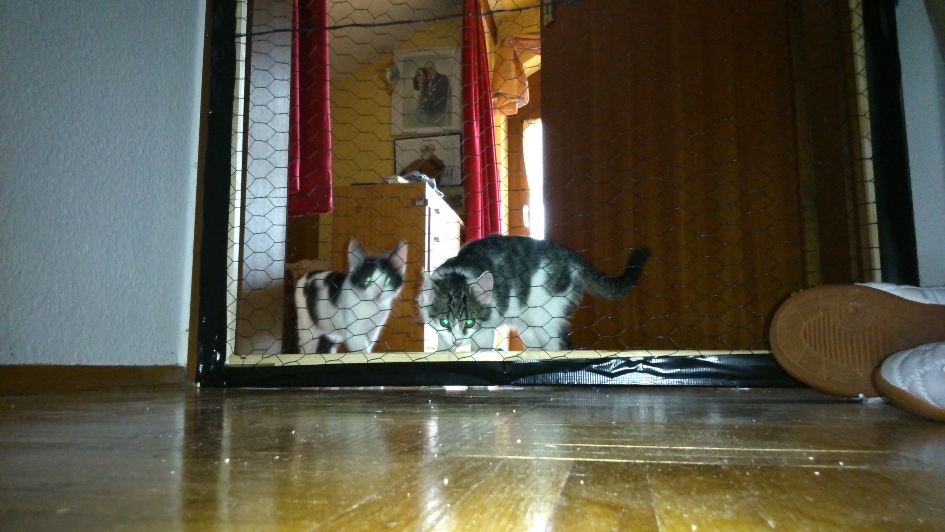 das Revier der beiden beschränken – sie sollen aber die Möglichkeit haben, sich zu beriechen und kennenzulernen. Daher habe ich ein „Begegnungstor“ gebaut. 4 Leisten in Türgröße zusammengeschraubt, Kaninchen- oder Hühnerzaun draufgetackert, Tackerseite mit Panzerband abgeklebt, zwei Türscharniere dran und mittels Häckchen gesichert. Ist nicht sehr stabil – aber zwei 1,5kg Kätzchen hält es locker ab. Der „Dicke“ hat auch kein Interesse, zu den zweien reinzugehen, also reicht das so.